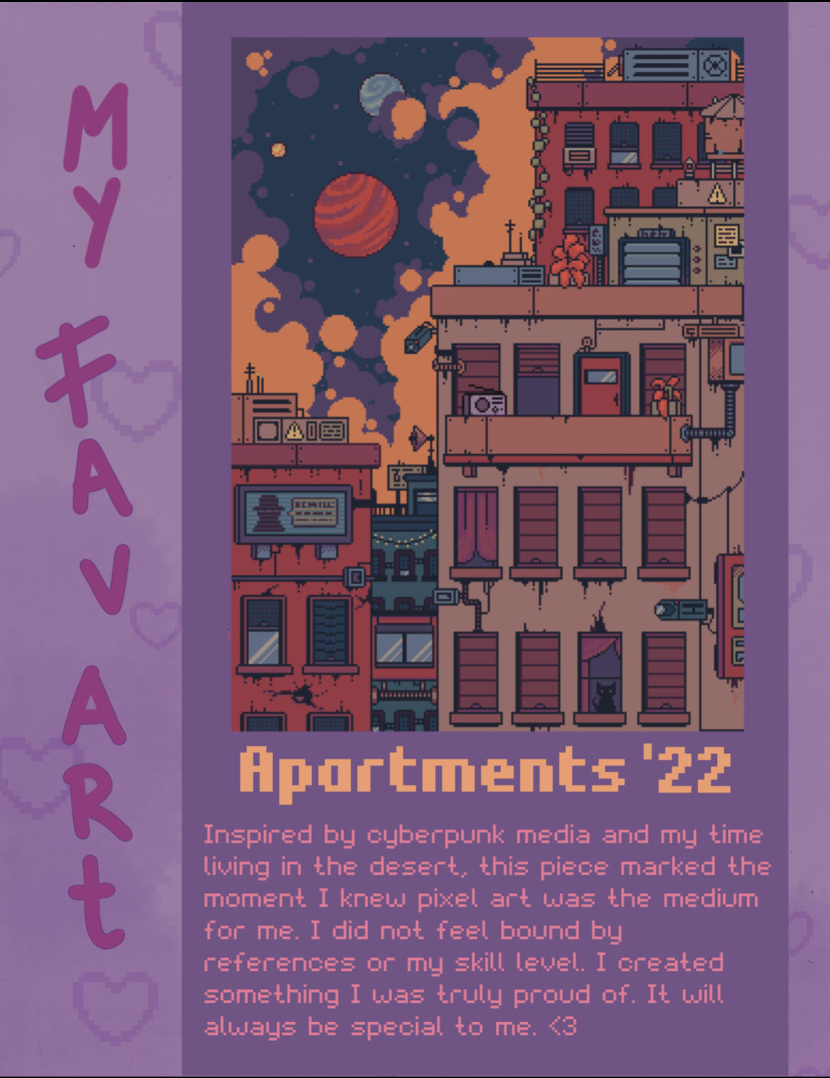 I create nostalgic, cozy artwork transporting you into a whole different world. Adventure awaits in each of my pieces~Muted color palettes and punchy focal colors are my thing. You'll see them a lot in my work.I also love to create artwork about dystopian landscapes, sci-fi westerns, and fantasy role-playing games.Unlike the size of my canvas, I don't creatively restrict myself!Thank you for checking out my site & just know each pixel is handled with care! ♡